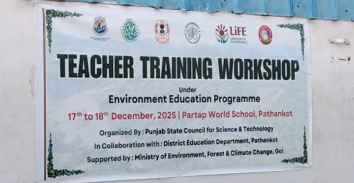 पठानकोट: स्थानीय प्रताप वर्ल्ड स्कूल में पंजाब राज्य विज्ञान एवं प्रौद्योगिकी परिषद (PSCST) और जिला शिक्षा विभाग के सहयोग से दो दिवसीय जिला स्तरीय शिक्षक प्रशिक्षण कार्यशाला का सफल आगाज हुआ। पर्यावरण, वन एवं जलवायु परिवर्तन मंत्रालय (भारत सरकार) के समर्थन से आयोजित इस ‘पर्यावरण शिक्षा कार्यक्रम’ में जिले के विभिन्न स्कूलों के लगभग 50 शिक्षकों ने भाग लिया।